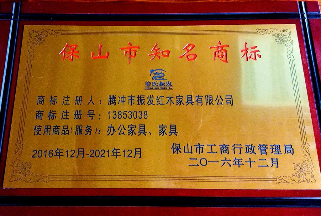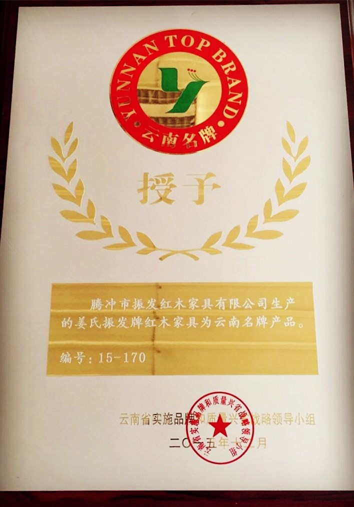 公司于2013年12月当选为腾冲县红木家具商会会长单位,2014年9月当选为云南省家具行业协会常务副会长单位,2014年9月在北京荣获中国古典红木家具行业功勋勋章,2014年11月在上海当选为中国木材检验联盟会员单位,2015年12月荣获保山市知名品牌称号,2015年12月荣获质量走廊示范标杆企业称号,2015年12月被评为腾冲市工商联合会(商会)先进会员,2015年12月被评为腾冲市优强民营企业,2015年12月荣获云南名牌,2015年12月当选腾冲市光彩事业促进会理事单位,2016年12月荣获保山市边疆质量走廊示范企业称号,2016年6月被评为3A级标准化良好行为企业,2016年7月当选为云南省木雕协会副会长,2016年10月荣获保山市企业技术创新中心,2016年12月被评为“保山知名商标”,是一个高品质的红木家具品牌。